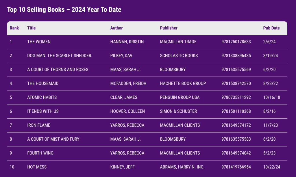 5 Circana, (no date), Top 10 Selling Books – 2024 Year to Date Accessed 23. Feb 2025, [online]